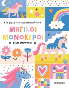 ISBN: 978-618-03-4567-4 ΒΟΗΘ. ΚΩΔ. MHX/ΣΗΣ 84567 Απόλαυσε ευχάριστο και δημιουργικό χρόνο με τους αγαπημένους σου μονόκερους! Στο βιβλίο αυτό θα βρεις ευχάριστες δραστηριότητες, για να ζωγραφίσεις, να συγκρίνεις και να συμπληρώσεις εικόνες, να παίξεις με τα γράμματα και τους αριθμούς και να κάνεις κατασκευές. Τ βιβλί των δραστηρι τήτων ΣΤΕΦΙ ΜΠΡ0Κ0ΛΙ Η Στέφι Μπρόκολι είναι εικονογράφος και συγγραφέας βιβλίων με παιχνίδια και δραστηριότητες για παιδιά. Της αρέσουν το κέντημα, η κεραμική, η ζωγραφική στον τοίχο και η ποδηλασία. Ζει στο Παρίσι. Με πολύχρωμες κάρτες για τα μηνύματά σου! Από 4 ετών